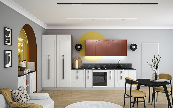 - Арочная фрезеровка фасадов кухни Арко Атриум — не просто декор, а стилистический код, в котором зашифрованы вечная красота и гармония. Её изгибы создают рельеф, в котором играет свет, а тени оживляют поверхность, превращая ее в часть живого пространства. Контрастный терракотовый верх фасадов словно напоминает о закатах над морем, а спокойный матовый низ оттеняет его, создавая баланс и глубину. Кухня становится не только зоной для приготовления еды, но и настоящей архитектурной доминантой интерьера.