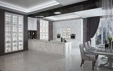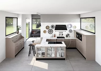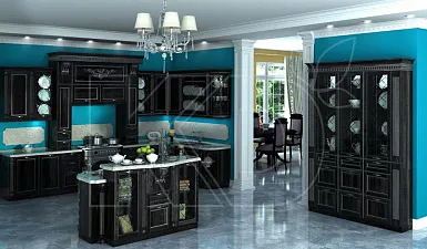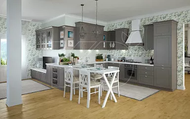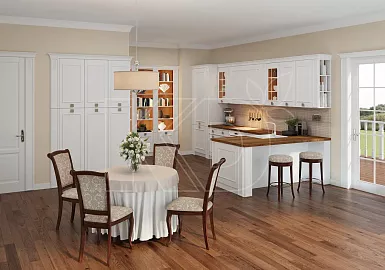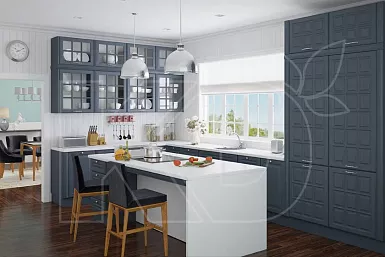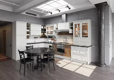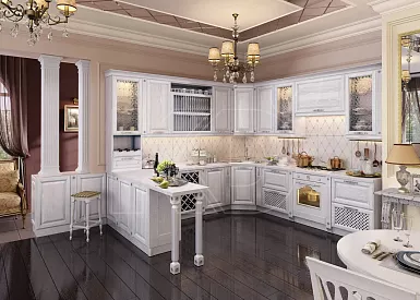 - Размер. Мебель размещается в больших столовых и поэтому имеет большие размеры. Планировка - П-образная или квадратная, обычно с островом. Кухонные гарнитуры более сложные и часто имеют барную стойку или витражные шкафы. Дешевые модели обычно меньше по размеру и имеют линейную планировку.