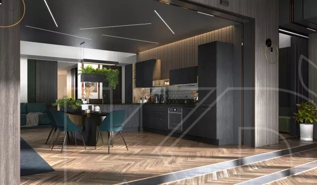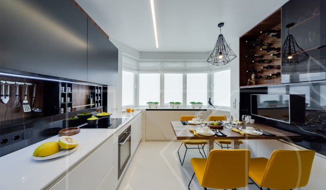 • любая современная кухня черного цвета обладает привлекательным внешним видом, если предварительно объединить ее с имеющейся гостиной комнатой либо использовать в качестве проходной.