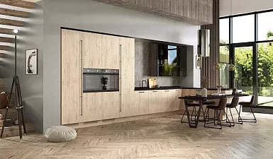 Широкое применение плита на кухне нашла во всем мире, где ее ценят не только эстетические качества этого универсального материала, но и возможность использовать более бюджетные комплектующие при обустройстве и стилизации современных мебельных фасадов с имитацией спила натуральной древесины и шпона.