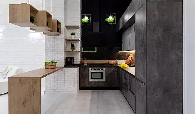 Расширенные возможности в выборе актуального дизайна при стилизации кухонных интерьеров позволяют использовать экоплиты для оформления фасадов не только уголков и модулей, но и эффектных гарнитуров.