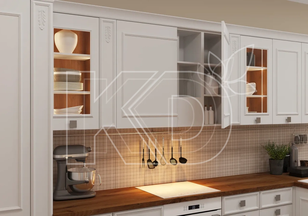 Светлые породы типа ясеня и беленого дуба в сочетании с белыми фасадами выглядят спокойно и невыразительно, но такое решение может подойти тем, кто хочет сделать стены или потолок максимально акцентными и добавить большое количество декора.