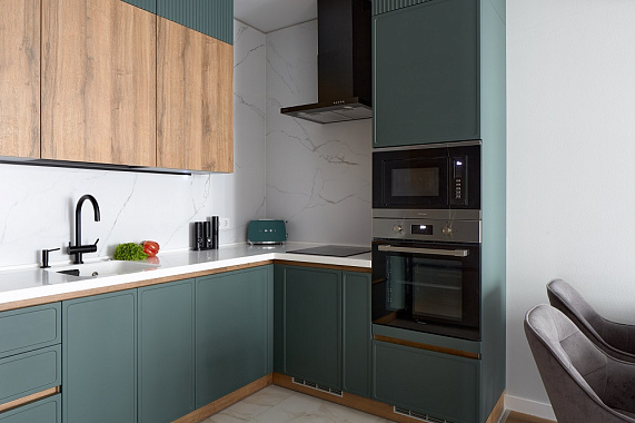От выбранного материала зависит не только эстетика, но и долговечность. Например, фасады из массива лучше всего смотрятся в просторных кухнях с островом, а лаконичные эмалированные поверхности оптимальны для проектов, где важна компактность и эргономика.