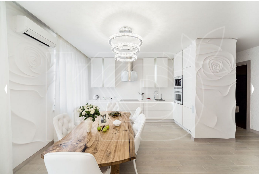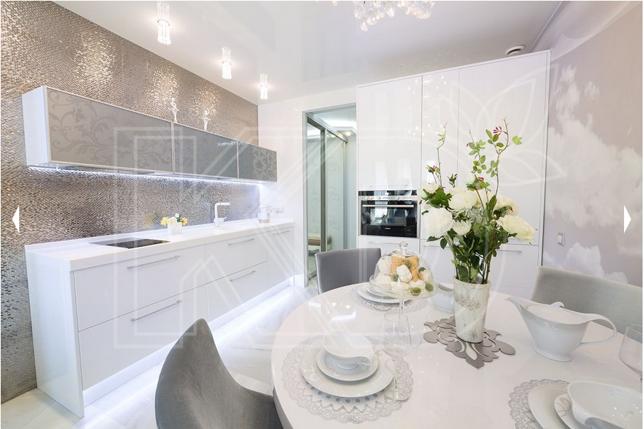 Дизайн белой глянцевой кухни можно оформить по-разному. Этот цвет универсален и будет сочетаться с любыми другими оттенками.