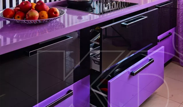 Использование фиолетового в дизайне кухни предполагает правильный выбор стиля оформления, а также цветовой гаммы, которая будет реализована в помещении. Необходимо продумать все мелочи, чтобы кухня на заказ по индивидуальным размерам выглядела стильно и современно и не была перегружена.
