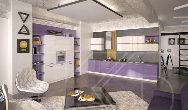Чаще всего кухни в фиолетовых цветах выполняются в таких стилях, как лофт, модерн и хай-тек. При этом фасады обычно делают зеркальными.
