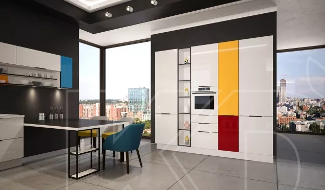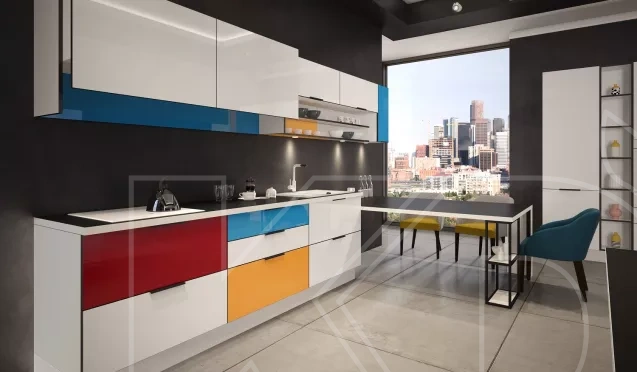 • Зрительное уменьшение помещение. Большое количество яркой мебели для кухни делает маленькую кухню визуально меньше.