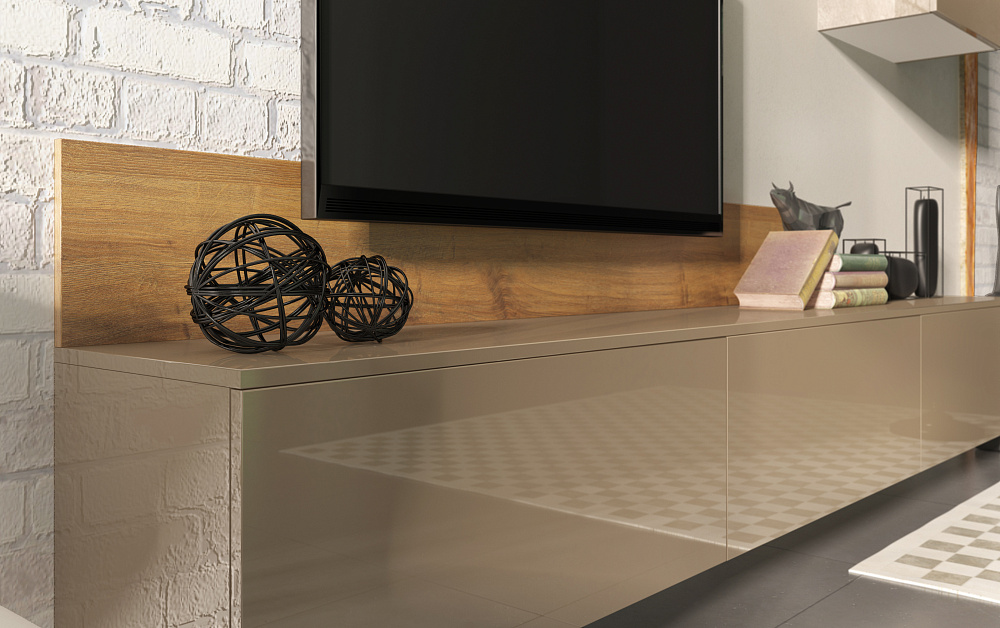 Здесь нет ни одной лишней детали – образ выверен и сбалансирован с ювелирной точностью! Глянец фасадов «Глории» привлекает внимание и создаёт канву образа, а элементы из экоплиты расставляют акценты, придавая гостиной выразительность и глубину.