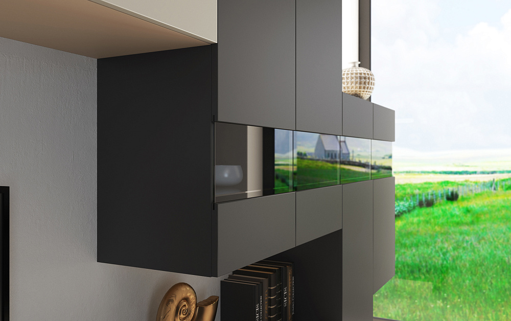 Чем еще покоряет модель? Умением гармонично сочетать разные виды материалов. Так, полки и шкафы здесь имеют интегрированное в фасад стекло. Комбинация бархатистых и гладких поверхностей полностью вписывается в философию этой гостиной. «Ханна Натив» берет противоположности и создаёт с их помощью нечто неповторимое. Например, Ваши интерьеры!