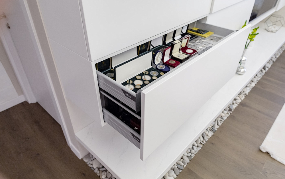 Ее облик – это кристальная белизна снегов, чёткость линий и безупречная эргономика. Пятнадцать вместительных глухих ящиков позволят хозяйке хранить многие вещи вдали от посторонних глаз. А для всего самого привлекательного предусмотрены большие открытые ниши. Вместе они составили стильную композицию, обрамляющую тв-портал. Благодаря такому решению телевизор становится органичной частью облика гостиной и выглядит как живое окно между мирами природы и технологий.