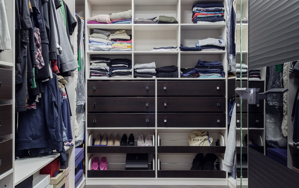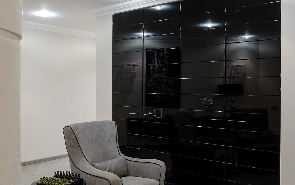 Прихожая выдержана в стиле минимализм с элементами английской классики: игра цветовых контрастов сразу задает настроение при входе в квартиру. Она продолжена в комнате, о которой мечтает каждая женщина – в просторной гардеробной. В светлых ящичках поместилось все, и даже больше, как и в открытых темных нишах. Дальше – больше: спроектировали и создали встроенный шкаф с высокими белоснежными дверцами и металлической вставкой, ТВ-портал, эксклюзивные элементы спален – например, будуарный столик с зеркальными вставками. Каждый элемент мебели продуман до мелочей, а исполнение его можно считать вершиной мастерства производителя.