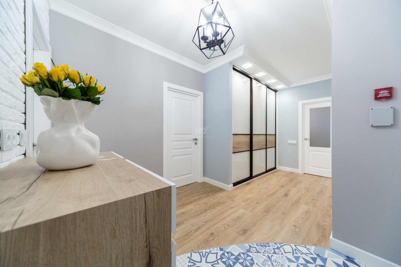Для наших замечательных клиентов была спроектирована прихожая, в которой царит лаконичность – оригинальный пенал и шкафчик для обуви знают свое место и дело, отлично справляясь с функцией размещения полезных вещей. Встроенный шкаф коридора украшают раздвижные дверцы с оригинальным декором, которые хозяева заказали в бренда «Кухонный Двор». Шкаф-купе для спальни тоже дело рук мастеров нашей бренда, но для этой комнаты выбрана более нежная и спокойная цветовая гамма.