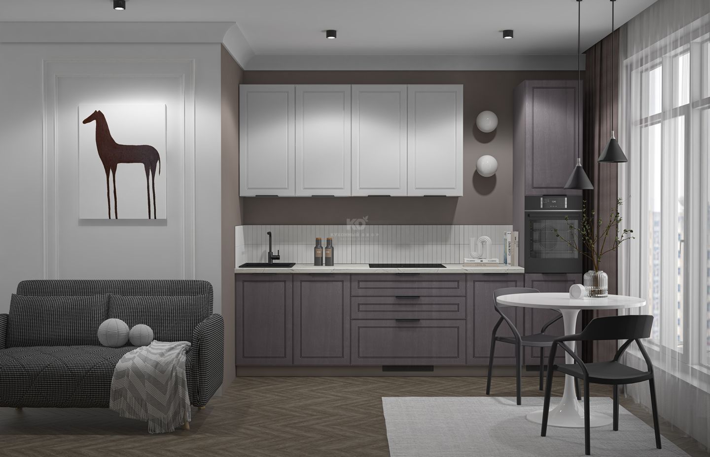 Фасады Леи изготовлены из МДФ, покрытой экомембраной в технологии 3D-окутывания без кромок, что обеспечивает устойчивость к механическим повреждениям и долговечность. Они приятны на ощупь и придают интерьеру благородный, сдержанный вид. В комплектацию входят все необходимые элементы, включая столешницу, фурнитуру и пеналы для встроенной техники. Итог — чистота линий и максимум полезного пространства при визуальной компактности.