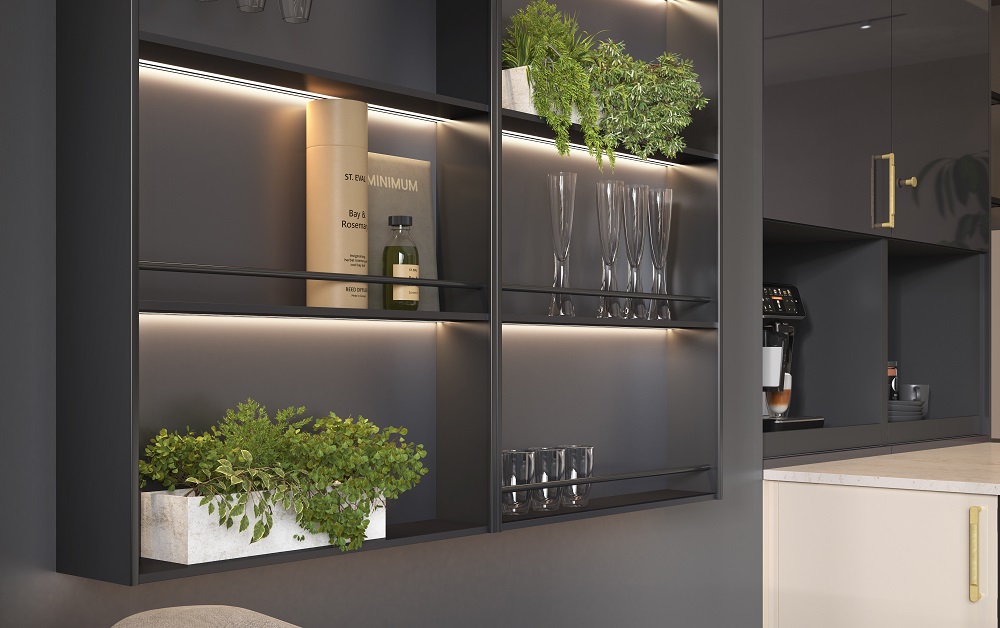 • Выразительный декор. Для «Флер Манифик» доступны декоративные элементы «Cubo» с подсветкой. На их основе можно создать вместительные открытые зоны для хранения посуды, утвари, продуктов и интерьерных украшений.