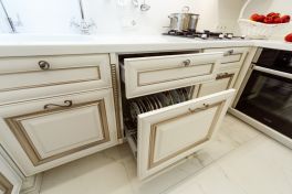 Кухонный гарнитур – тонкая работа мебельных мастеров. Фасады из МДФ молочно-белого оттенка собрали по той же технологии, что и настоящие деревянные: рамки и филенки соединяли друг с другом по отдельности. Сверху поверхность покрыли патиной оттенка припыленного серебра. Все ящики дополнили изогнутыми ручками под состаренное серебро в тон патине. П-образную кухню спланировали таким образом, чтобы она была удобна для человека с ограниченными возможностями. Основную рабочую столешницу опустили на 10 см от стандарта, а у окна разместили обыкновенный стол без ящиков, чтобы его можно было использовать, сидя в коляске. Кроме того, два верхних шкафчика повесили ниже обычного уровня, чтобы сделать их доступными для героини. Духовой шкаф размещен в нижнем ярусе, рядом со столом без ящиков: хозяйка сможет подъехать к духовке максимально близко. Чтобы облегчить доступ, в нижнем ярусе справа от мойки разместили сушку для посуды с решеткой для чашек и держателями для тарелок (в нее будет удобно складывать посуду из посудомойки). Над выдвижной сушкой – ящик для столовых приборов.Чтобы задействовать все полезное пространство, нижний угловой шкаф оснастили выдвижными полками в виде неправильной восьмерки. Здесь отлично поместятся кастрюли, сковородки и другие крупногабаритные предметы. Верхние центральные шкафчики опустить было невозможно, так как в один из них встроена вытяжка, которую необходимо вешать на расстоянии не менее 70 см от плиты. Поэтому левую секцию оснастили лифтовым механизмом, который позволяет опускать содержимое полки до комфортного уровня. Ручку механизма можно привести в движение крючком от половника или любым другим предметом.Вторая рабочая поверхность стандартной высоты, так что будет удобна для дочери героини (к тому же под столешницей встроена бытовая техника). Над рабочей зоной повесили буфетный шкафчик с точеными пилястрами и стеклянными дверцами с фацетом и гравировкой. Фартук под ним отделан наборными панелями «Буазери». В две симметричные колонны встроены отдельные холодильник и морозильник: хранение продуктов специально разнесли по двум секциям, чтобы хозяйка могла без труда достать все необходимое. Под столешницей разместили стиральную и посудомоечную машины, а также ряд выдвижных ящиков для мелочевки.
