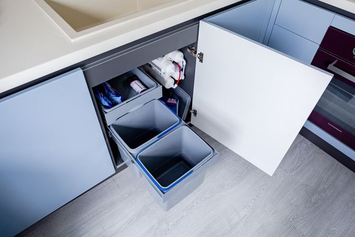 В зависимости от типа фасадов, для их открывания используются две системы – «Tip-On» и «Space Line». Первая отлично подходит для фасадов верхнего яруса и не нарушает их монолитность. А вторая подчёркивает контуры кухни и создаёт иллюзию «парящей» столешницы. Кстати, рабочая поверхность и корпус выполнены в одном цвете, поэтому кажется, будто столешница «ниспадает» на пол. Выглядит очень эффектно, особенно в сочетании со «Space Line» и графитовыми цоколями!