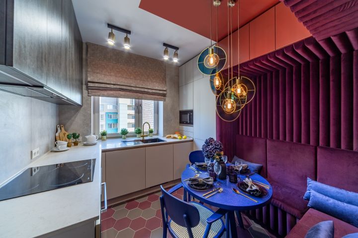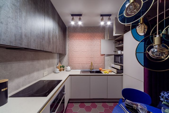 Зона 3 – сочный инжир. Сочности и комфорта хватит на всех! Кухня плавно перемещается в лаунж-зону, продолжаясь в фасадах цвета мякоти инжира. Эта часть комнаты просто создана для того, чтобы встречать гостей и наслаждаться вкусными блюдами!
