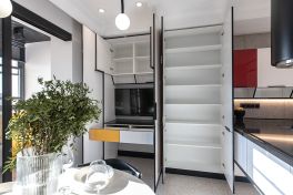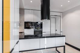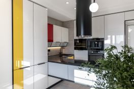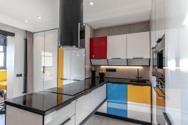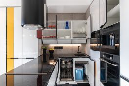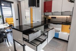 «Мондриана» притягивает взгляд своей лёгкостью и озорной игрой цвета. А что насчёт эргономики и внутреннего оснащения? Здесь тоже нареканий нет! Кухня имеет П-образную компоновку с варочной панелью посреди многофункционального острова. Каждая зона под рукой, поэтому готовить легко и комфортно. Ящики здесь оснащены множеством органайзеров и современными системами хранения. А техническому оснащению модели порадовался бы и ресторанный шеф-повар! Здесь помимо варочной панели присутствуют: посудомойка на 10 комплектов, винный шкаф с сенсорным управлением, кофемашина, вместительная духовка, большой двухкамерный холодильник и мощная вытяжка. В таких интерьерах кулинарное творчество полностью свободно от границ и условностей! Именно так и задумывалось, ведь «Мондриана» – это искусство готовить с удовольствием!