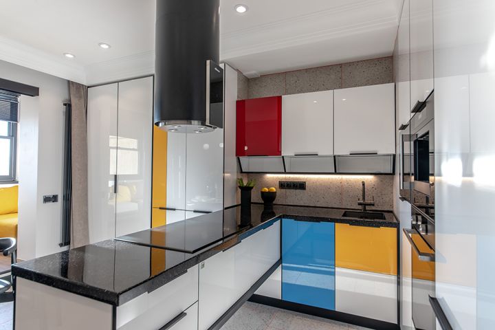 Обставить дом со вкусом – своего рода искусство. Вот почему когда за это дело берутся профессионалы, может получиться шедевр. Примерно так произошло в очередном выпуске передачи «Квартирный Вопрос». Мы сотворили для большой, дружной семьи Давыдовых-Климовых настоящую кухню-картину. Почему «картину»? Потому что, работая над ее обликом, дизайнеры «KD-Lab» вдохновлялись творчеством великого голландского абстракциониста, Пита Мондриана. В его честь кухня и называется – «Мондриана». Давайте взглянем, чем она покоряет сердца!Настоящее произведение искусства – смесь красоты и смелых решений. У «Мондрианы» с этим полный порядок! Ее фасады создаются из МДФ и покрываются высокопрочным ультраглянцем. Ведущий цвет – белый, сочные акценты – красные, синие и жёлтые. Точь-в-точь как на полотнах голландского мастера абстракции! Кромки корпусов и фасадов выполнены в угольно-чёрном цвете, а столешница из искусственного камня – в цвете «звёздная буря». Контрастные кромки дарят кухне цветовую «глубину» и делают ее еще более выразительной.